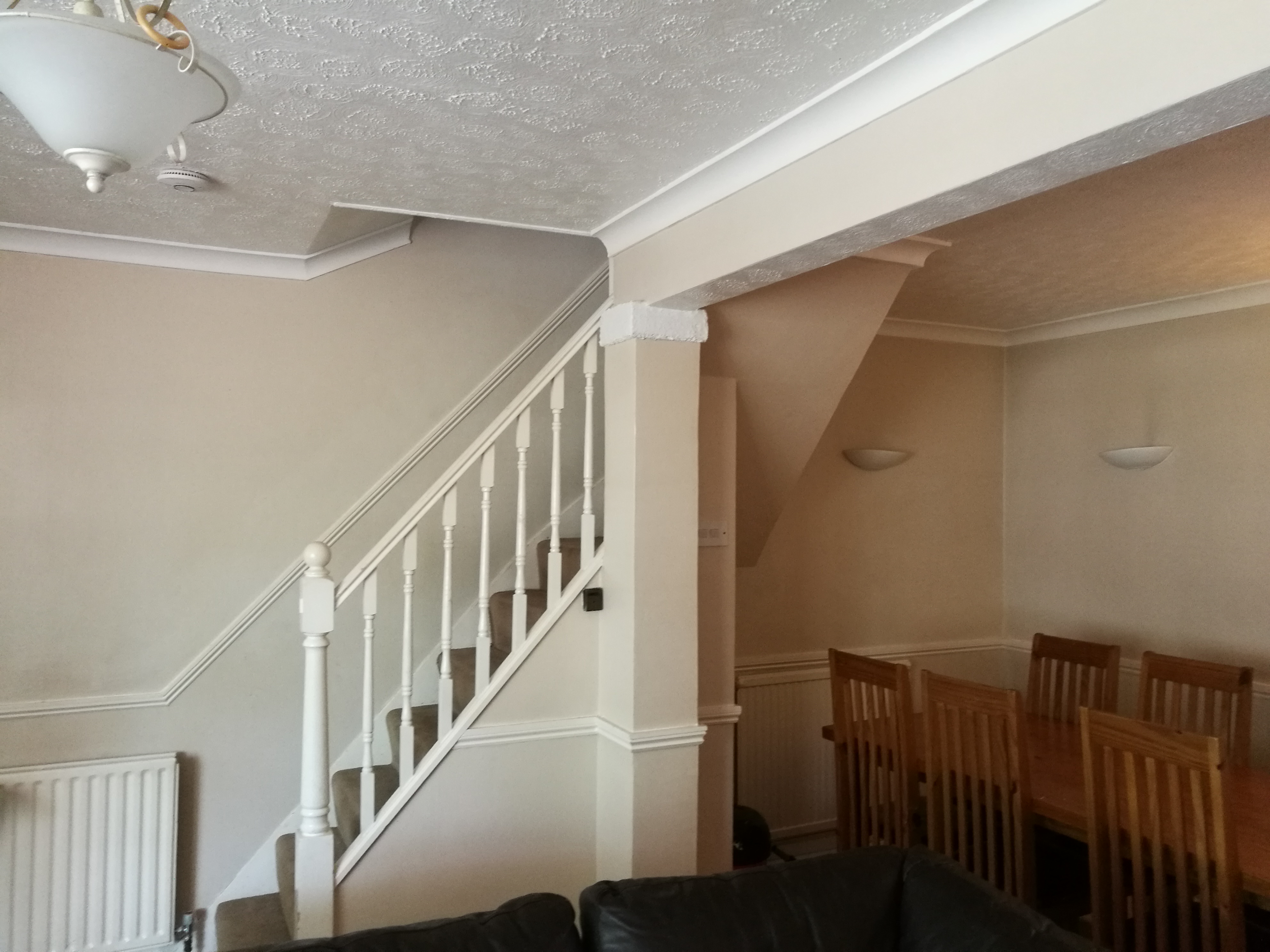 Want to pick the brains of anyone interior design minded or anyone with a similar house. My living room is a through lounge so I have the sofas at the front and dining table at the back. The 'hall' and stairs are also in the same room . There is a dado rail all round which continues up the stairs and round the landing. WTF do I do decor wise with it. A few points.