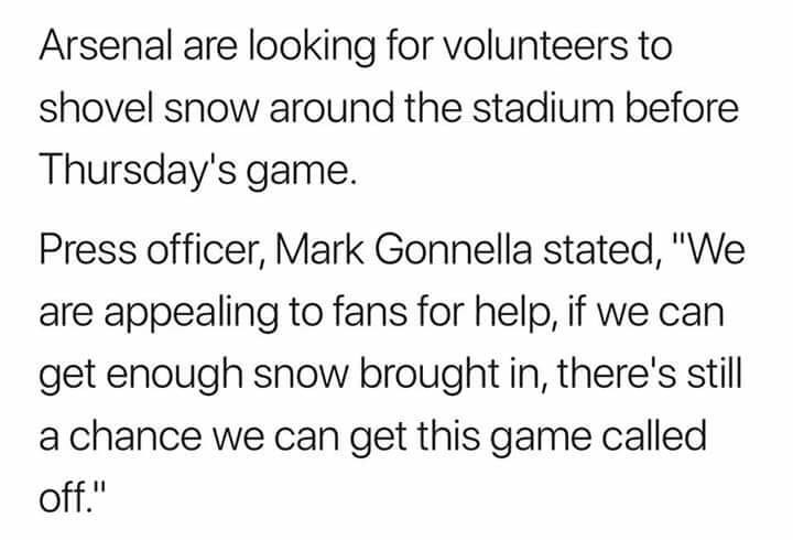 Despite a day when an in-wall pipe froze and we're stuck with only cold water, my football-hating wife agreed this was very witty. As for postponements, these days it's only lower league games that go unless it's due to spectator safety. Monday will probably have less chance of being cancelled than the weekend games, but that could help us stay out of the bottom 3 for a while longer.