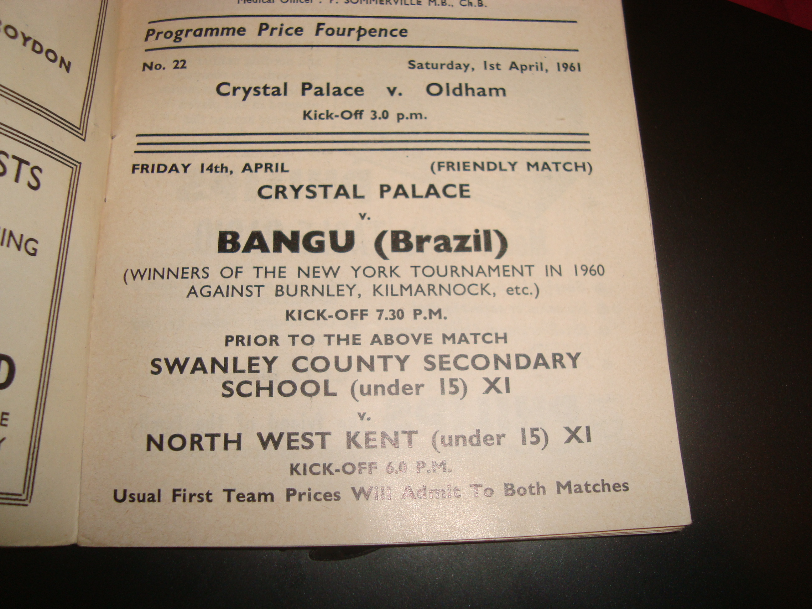 I was flicking through some old programmes and came across this flyer for a game to be played at Selhurst Park on Friday 14th April 1961 against Bangu of Brazil. Whilst I have been to Rio and know the area I must admit I had never heard of them and it seems strange why a game had been arranged against Palace. It appears that Bangu won the 1960 New York Tournament but was their prize a trip to London to play Palace? I cannot find anything about the game, result, attendance etc. Can anyone shed some light on why it was played and the result?