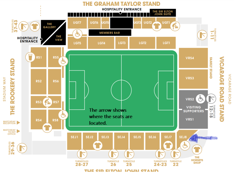 I have 2 Adult tickets for the away game at Watford in the home section in block SEJ8 (The Sir Elton John Stand), this stand is near to the Palace away section of VRS1 & VRS2 the seats are next to each other, sold at face value of £40 each and must be sold as a pair for £80.