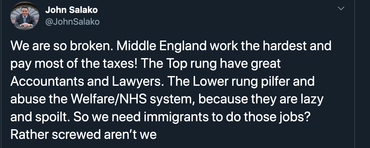 Old Salako's not currently doing his profile any favours Salako for PM he has a point. I heard a heart breaking tale on the radio of woman who is a full time carer for her disabled husband and doesn't qualify for most of the benefits. A friend has a family of scrounger neighbours they are all at it. It always seem that the good decent people get screwed, the rich don't care as they don't need it and the scum are taking home sack loads of money. This country is paid for by the decent working / middle classes who are too polite to say enough what do I get for all my taxes.