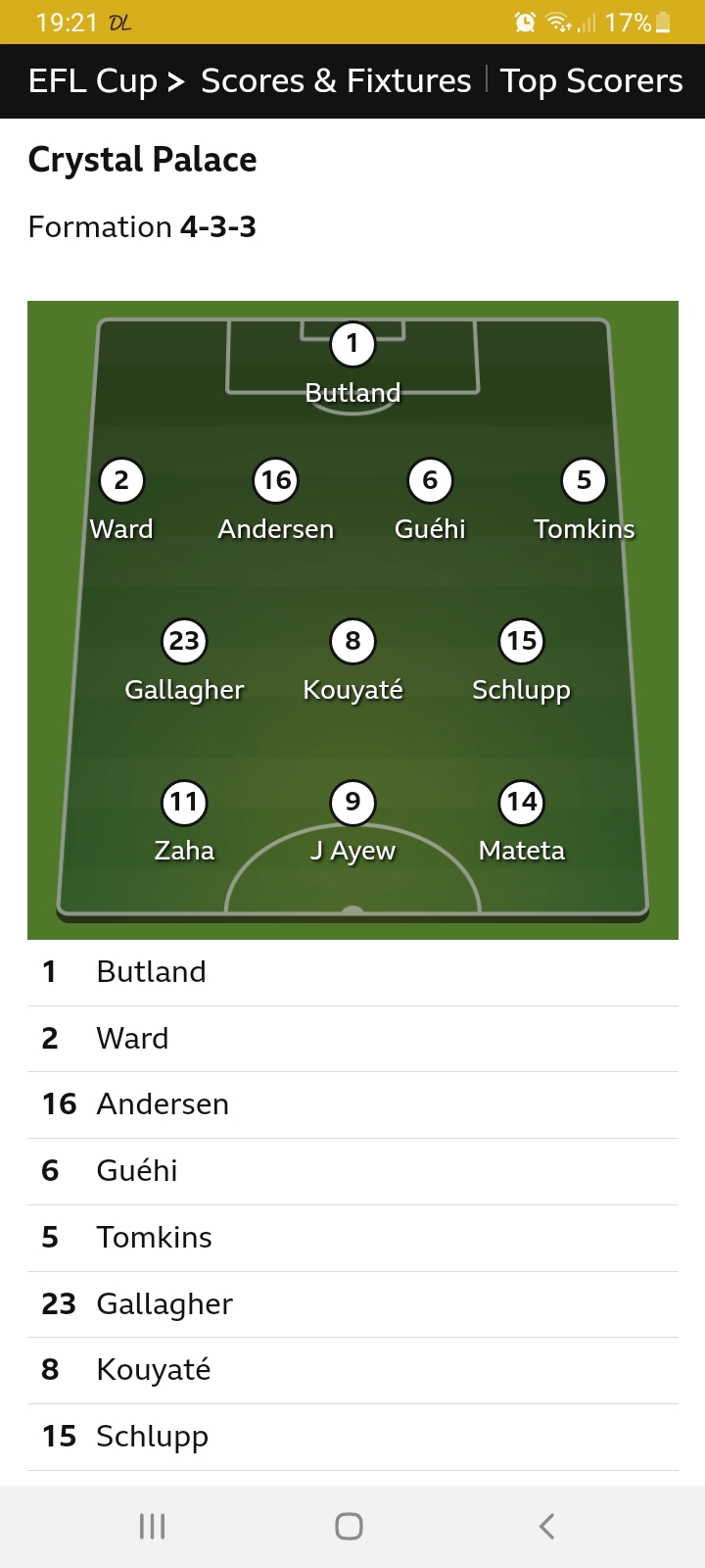 Watford: Foster, Rose, Sieralta, Ekong, Ngakia, Etebo, Louza, Sema, Fletcher, Hernandez, King. Subs: Elliott, Cleverley, Cathcart, Femenia, Dennis, Baah, Alvarado. Palace: Butland, Tomkins, Andersen, Guéhi, Ward, Schlupp, Kouyaté, Gallagher, Ayew, Zaha, Mateta. Subs: Guaita, Mitchell, Kelly, Riedewald, McArthur, Rak-Sakyi, Benteke Edited by Daddyorc (24 Aug 2021 7.02pm)