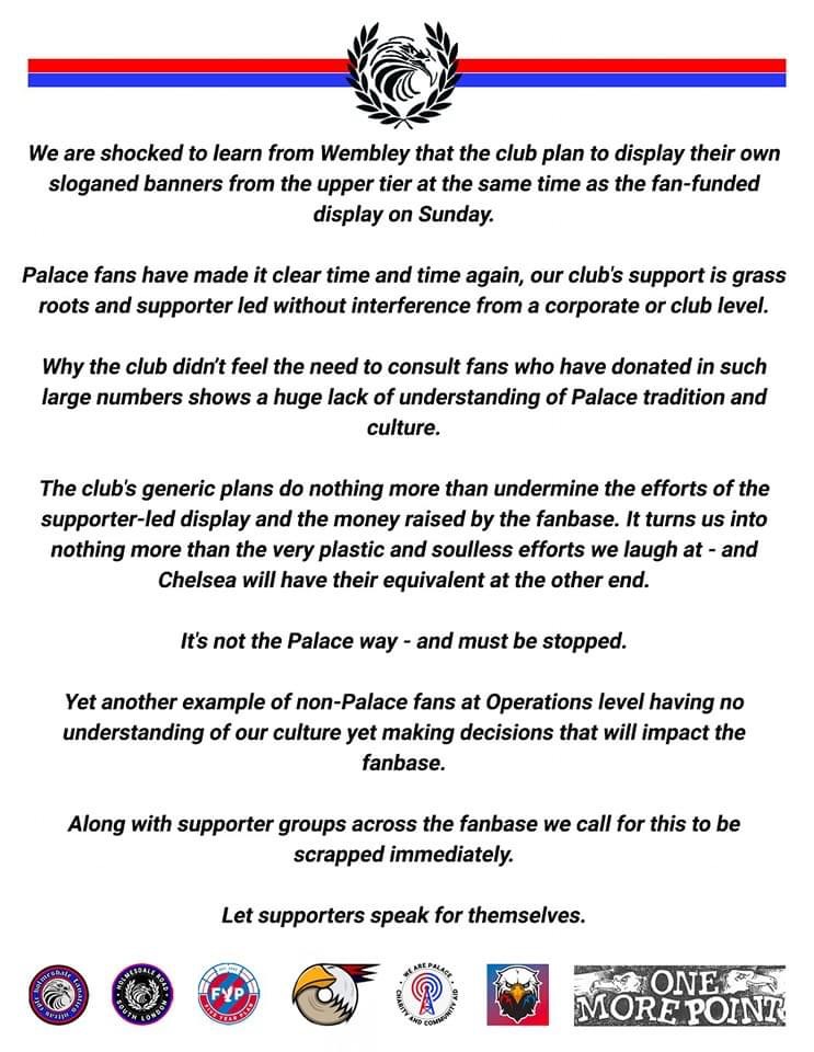 I think what can rub people up the wrong way is the way HF sometimes talk as if the Palace fanbase had a referendum on the matter they're raising, whereas in fact this is a small section of the fanbase, just the one with the loudest voice. It sounds harsh, but I really don't imagine there are many people outside the HF who really give a cr@p about the displays. Personally I'd rather there was nothing distracting from what all Palace fans can surely agree on and that's beating Chelsea.