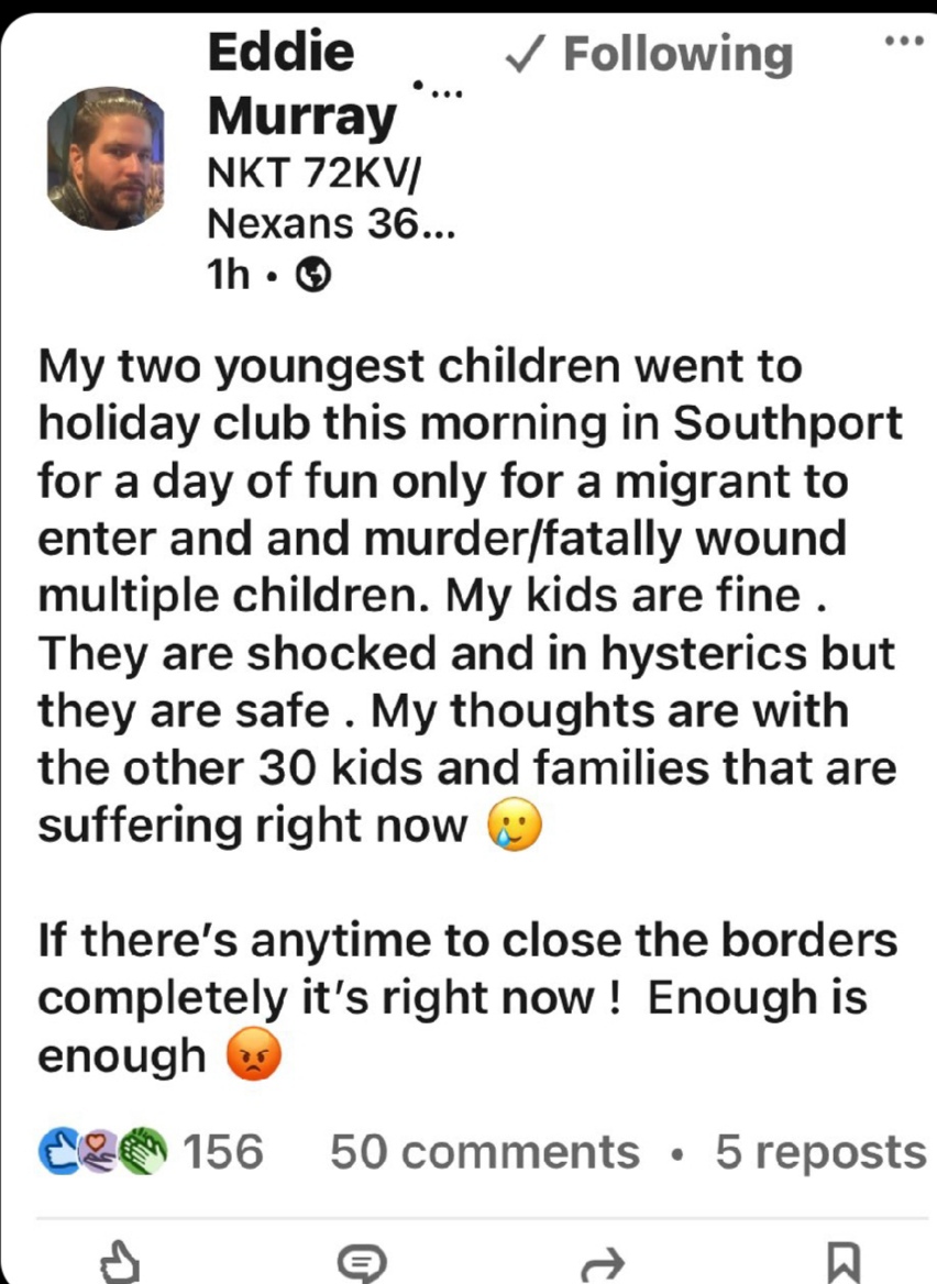 If this had happened a few years ago, it would have stopped the country. Now it is just a monthly occurance. We can thank our indifferent governments and all the contemptible useful idiots, some of whom frequent these boards and, needless to say, the other site, who continuously defend mass immigration and proclaim the innocence and peaceful nature of the majority of immigrants. We don't know the identity of this lunatic yet, but I doubt I'll need to come back to apologise if he turns out to be an 'Anglo Saxon'. We are all becoming hardened to this stuff, but that is not enough. We must become angry. We must stop this insanity. Our politicians have abandoned us. Meanwhile, Tommy Robinson has fled the country under threat of rearrest under 'terrorism laws'. Edited by Hrolf The Ganger (29 Jul 2024 3.15pm) This is absolutely terrible, however, i'm not sure what you want politicians to do. Clearly mental health is a big issue, however you want to categorise people - religion, ethnicity, socio economic background etc and these services have been constantly cut over the years. Tommy R has fled the country to avoid a court appearance today - don't let the facts get in the way of a good rant.