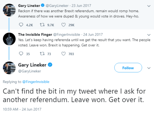 So Gary lineker thinks we should have a second referendum. Is this the same Gary lineker that said politicians should keep out of football during the world cup. Keep your opinions to yourself t***,you are being paid by the British taxpayers,some would say political bias by the BBC. Lineker needs to come to terms with the facts. Let me paraphrase someone: Leave Won. Get over it.