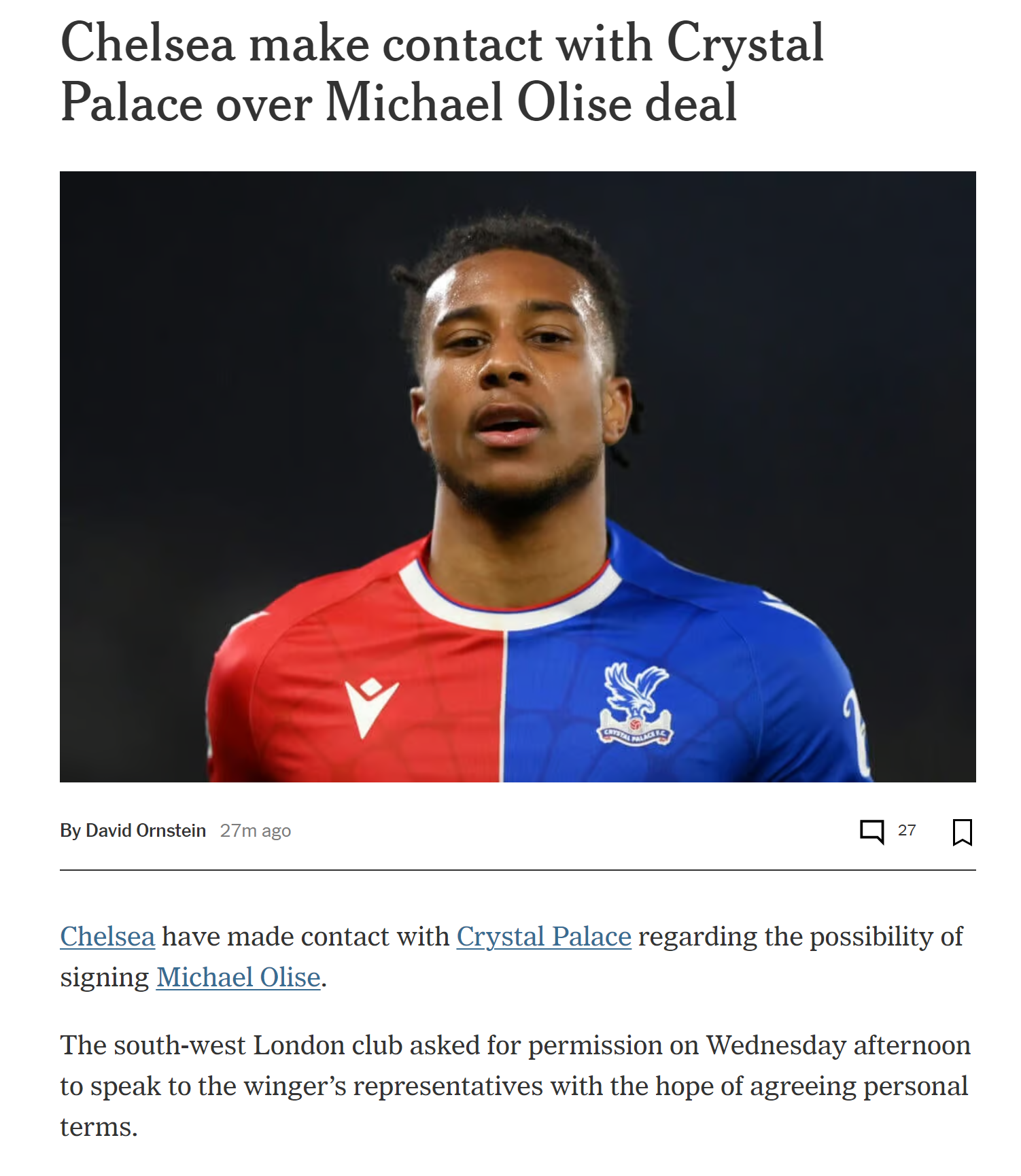 Just posted in The Athletic by David Orstein Chelsea have made contact with Crystal Palace regarding the possibility of signing Michael Olise. The south-west London club asked for permission on Wednesday afternoon to speak to the winger’s representatives with the hope of agreeing personal terms. The Athletic reported on Tuesday that interested parties have been advised to strike a deal with Crystal Palace before attempting to agree terms with Olise’s camp. Bayern Munich and Newcastle United have also contacted Palace, while Manchester United and Manchester City retain a strong interest in the playmaker. The 22-year-old came close to completing a move to Chelsea last summer but he opted to stay at Selhurst Park, signing a new four-year deal. His new contract made him one of Palace’s top earners and contains a new, higher release clause, believed to be in the region of £60m (€70.5m), which Chelsea are prepared to meet.