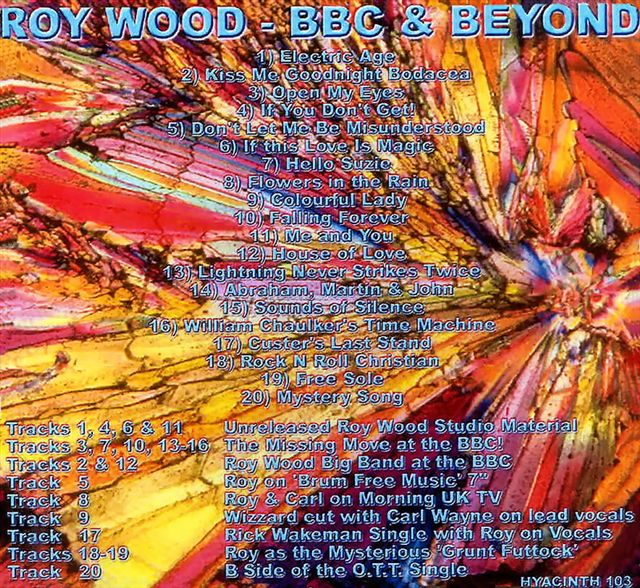01 Roy Wood - Electric Age 02 Roy Wood Big Band - Kiss Me Goodnight, Bodacea (Live at t 03 The Move - Open My Eyes (Live at the BBC) 04 Roy Wood, Jeff Lynne - If You Don't Get! 05 Roy Wood - Don't Let Me Be Misunderstood ('Brum Free Musi 06 Roy Wood - If this Love is Magic 07 The Move - Hello Susie (Live at the BBC) 08 Roy Wood, Carl Wayne - Flowers in the Rain (Live at Morni 09 Wizzard - Colourful Lady (Carl Wayne - Lead vocal) 10 The Move - Falling Forever (Live at the BBC) 11 Roy Wood, Jeff Lynne - Me and You 12 Roy Wood Big Band - House of Love (Live at the BBC) 13 The Move - Lightning Never Strike Twice (Live at the BBC) 14 The Move - Abraham, Martin & John (Live at the BBC) 15 The Move - Sounds of Silence (Live at the BBC) 16 The Move - William Chalker's Time Machine (Live at the BB 17 Rick Wakeman - Custer's Last Stand (Roy Wood - Vocal) 18 Grunt Futtock - Rock'n'Roll Christian (Roy Wood - Lead vo 19 Grunt Futtock - Free Sole (B-side) 20 Roy Wood - Mystery Song (B-side)