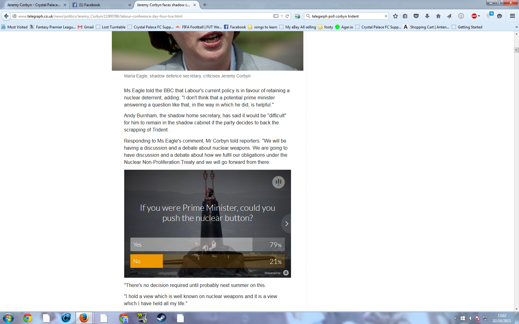 A poll in the Telegraph today showed 85% of respondents sided with Corbyn re the pressing the nuclear button question. Ahhh...another little 'grenade' to drop in and walk away from eh Nick? How many 'respondents' were there? Just to give it some context... It seems that the results have changhed! Thje question was 'if you were prime minister, could you push the nuclear button' Edited by nickgusset (02 Oct 2015 12.27pm)