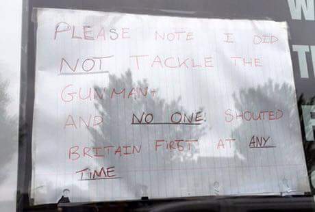 Allegedly this is in the shop window of the man who originally said 'Britain First' the guy wasnt even at the shop or in the area at the time. early reports unfortunately for him placed him there when he wasnt. multiple eye witnesses have said they heard it, some people said they didnt. this man has said to lbc that 'he has not spoken to anyone who heard that phrase' and that he is very concerned for his own personal safety at being linked to the claim he heard 'britain first'. hence the poster. Thats the full picture. the police appear to believe this man was probably a far right extremist with mental health issues who targeted the MP. even if he did shout the term obviously britain first have a great many members who would never dream of supporting his actions.