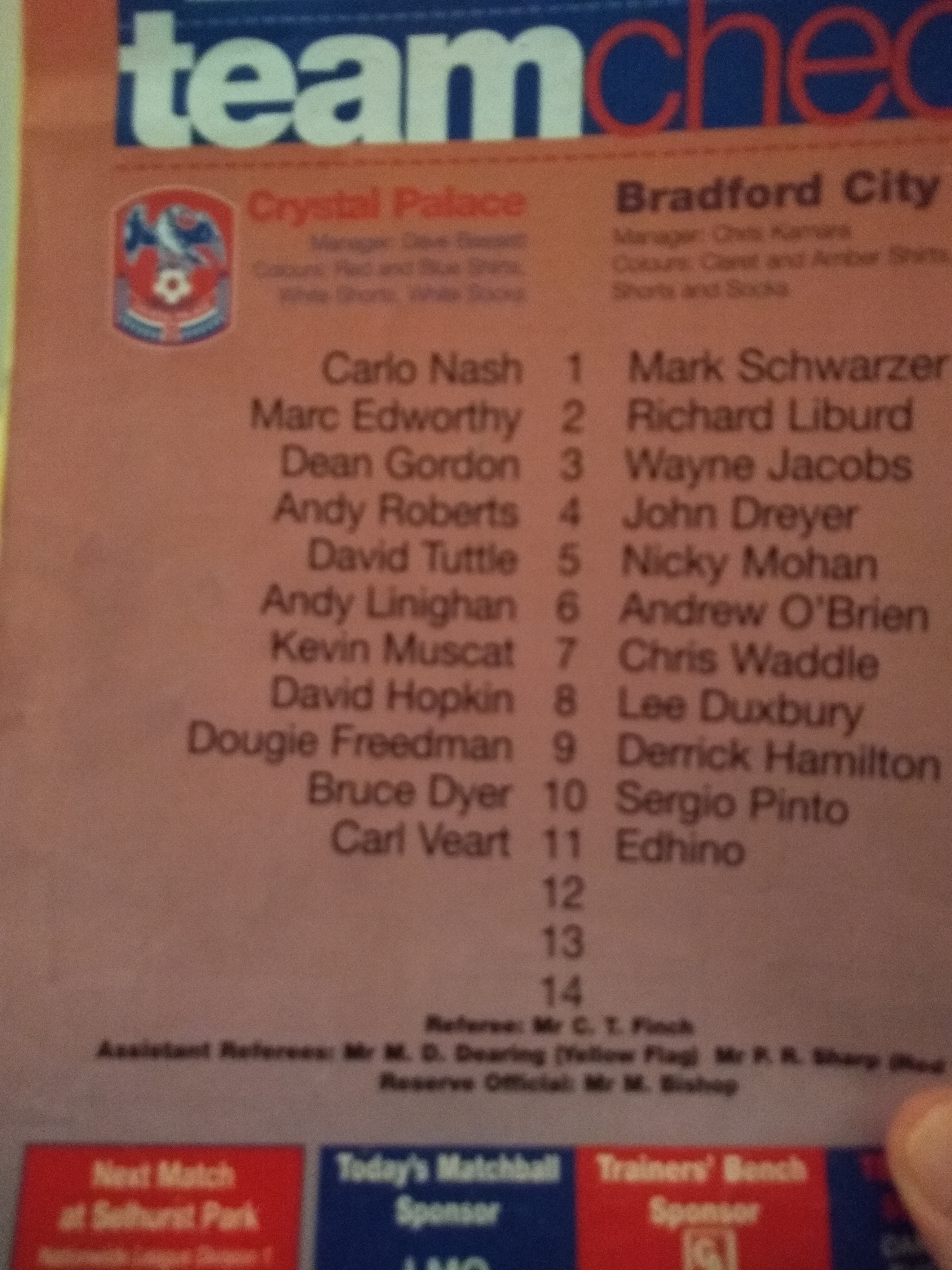 I know that website is all you’re relying on!!! You haven’t answered the fact that he played at Full back for us, Full back for Wolves, Full back for Rangers, Full back for Melbourne and Full back for Australia. The fact that other people have told you on here he played fullback for us and Never played at Centre Back in a back four. The fact that every clip on YouTube of all his tackles shows him playing at Full Back and the Palace seasons review video’s show him palying for us at FULLBACK and the fact he was routinely assigned the Right Back Number 2 shirt!......Everywhere! I don’t expect you to admit you were wrong, people like you don’t. I will also happily let you have the final say, as I know you will need to. But in fairness to other members on here, who are probably losing the will to live, I will draw a line under it and just say I don’t need to rely on Google for my information as at the time Muscat was playing for us I barely missed a game, home or away....and I saw first hand the position he played. Edited by Phil’s Barber (08 Feb 2019 9.53pm) No, it isn't what I'm going on. As stated, I looked up the old programs. It's just a matter of fact that the entire internet supports my position, because I'm correct. Here's a couple of photos which speak for themselves: especially regarding the illogical position of: "he was number 2 so must have been a RB". I've photographed a program from one of the games I went to. Looking at the line ups we can see that when he wasn't deputising for injury on either side, he was playing in a back three of a (most of the time) 3-5-2 formation. The players chosen supports this.