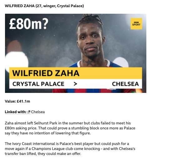 No way that Zaha is worth as little as £41m: Late 20s. Never settled at his only other move. Only performed at a decent level for 1 club (didn’t get in the team a lot on loan at Cardiff).