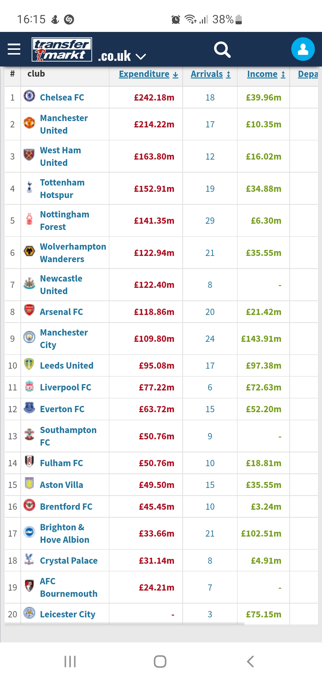 Notice how City have made money and Liverpool net spend £5 million. The big spenders W.Ham, Chelsea, Forrest, Newcastle, M.Utd
