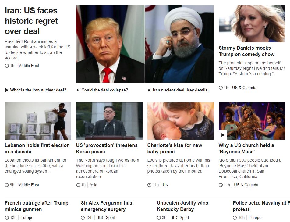 Today's BBC news home page screenshot attached shows the latest anti-Trump propaganda. Lead story shows its partisan towards President Hassan Rouhani(!), because he is Trump's enemy, and fails to properly explain why Trump is rightly looking at ripping it up. It fails to mention former Secretary of State John Kerry visiting Iran and working against his own country to thwart Trump. Story 2 is about a p*** star appearing on a comedy show! This is the BBC, not the Sun newspaper. Story 4 sees the BBC side with the North Korean dictator because of course, it's all USA's fault! Story 7 has another nation (France) ripping into Trump. And you wonder why Trump has a problem with the mainstream media?! All of those stories could have been written in a more neutral, or dare I say it, pro-USA way. Edited by Penge Eagle (06 May 2018 11.49am)