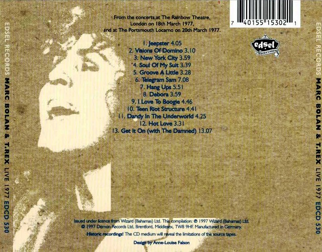 Todays second download is a bootleg by T.Rex that was recorded at two venues in March 1977. This is in superb quality and the audio was taken from gigs at the Rainbow in London on the 18th March 77 and also from a gig in Portsmouth on the 20th March 77. Some classic Bolan/T.Rex stuff on this one, with classics like "Jeepster", "Telegram Sam", "Hot Love" and "Get It On" which also features The Damned. Here is a download link I found for :- "Live 77" - Live in London and Portsmouth 18 & 20.3.77 - T.Rex (Bootleg) Quality : Superb Tracklisting : - Jeepster Download Link : [Link] Filesize : 151MB (Including Artwork) Back Cover : [Link] Enjoy!