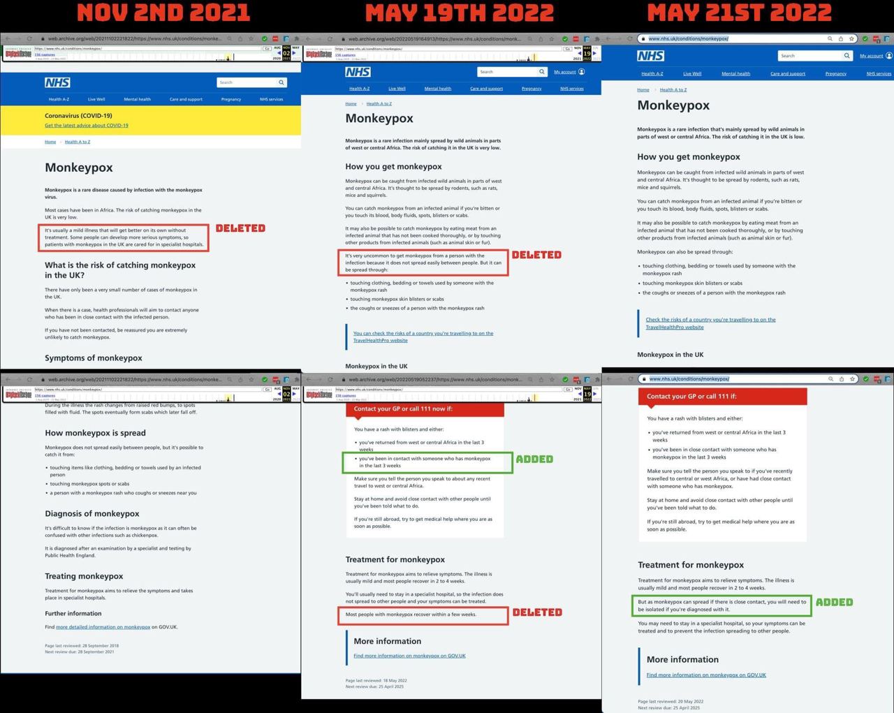 NHS has deleted key excerpts from its website stating that monkeypox is usually a mild illness that requires no treatment and is not easily spread from person to person. Additionally, they added an isolation requirement. Surely many of these changes can be explained through fact that it was perceived as a virus that was present elsewhere but is now appearing more locally.. It's an adjustment that is conistent with reality. It seems logical that there are tonnes of conditions almost never seen here that would have updated advice should impact closer to home. It's not an indication of some dark motive. While you seemed primed, almost hopeful (to fit a paranoid outlook) that we'll soon be all locked up due to monkeypox, the reality is that in most if not all cases it's very clear what someone has it, which limits spread. Moreover DNA viruses change much more slowly than the flu or even covid. It's perfectly sensible to not want monkeypox to spread but we're not going to be having monkeypox lockdowns or walking around in special monkeypox gloves or monkey outfits. It's just something for people to get stirred up about.