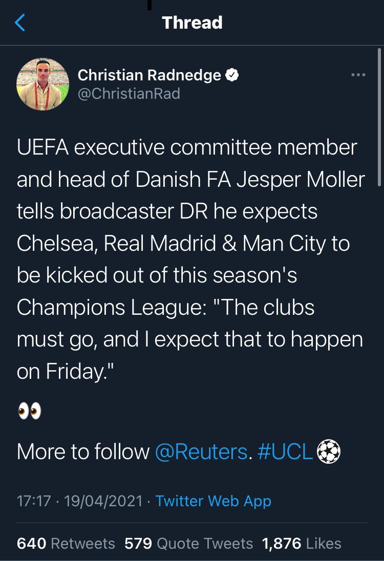 I have questions 1.. Where are these so called Super clubs going to buy players to keep them in this super league..I cannot think for one minute that these 12 clubs are going to have a transfer market between themselves and weaken their so called prospects of winning the JP Morgan Cup or are they going to rely on youth policy. ? 2/ Are not all Referees registered to UEFA and their respective Football Associations. Seeing as UEFA are against this Super League how are these Super matches going to be refereed or are they going to set up a Super league referee association. 3/ What is going to happen if these clubs players don’t want to play in this Super League how are these clubs going to enforce contracts they just cannot force a player to play nor can let they let a player walk away., All excellent points on Point 3 UEFA have just said they will ban players who take part. That's a bit unfair as they are contracted to the clubs I can't see that standing up in court.