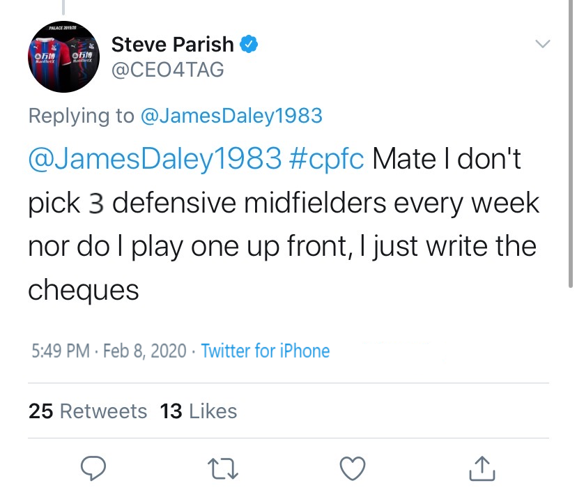 Interesting comment from Connor Wickham in Berkshire Live I’ve still got a year left at Palace. I think the intention is to go back to Palace. The chairman (Steve Parish) has made that quite clear to me. Is the chairman picking the squad nowadays? Parish to Hodgson "When we paid peanuts for Jordan Ayew it was because we thought he was crap and would help in our demise back to the championship, then the bugger plays out of his skin and moves upto to middle table safety. FFS get the useless lump Benteke back in and stick Ayew out wide where he can do less damage".