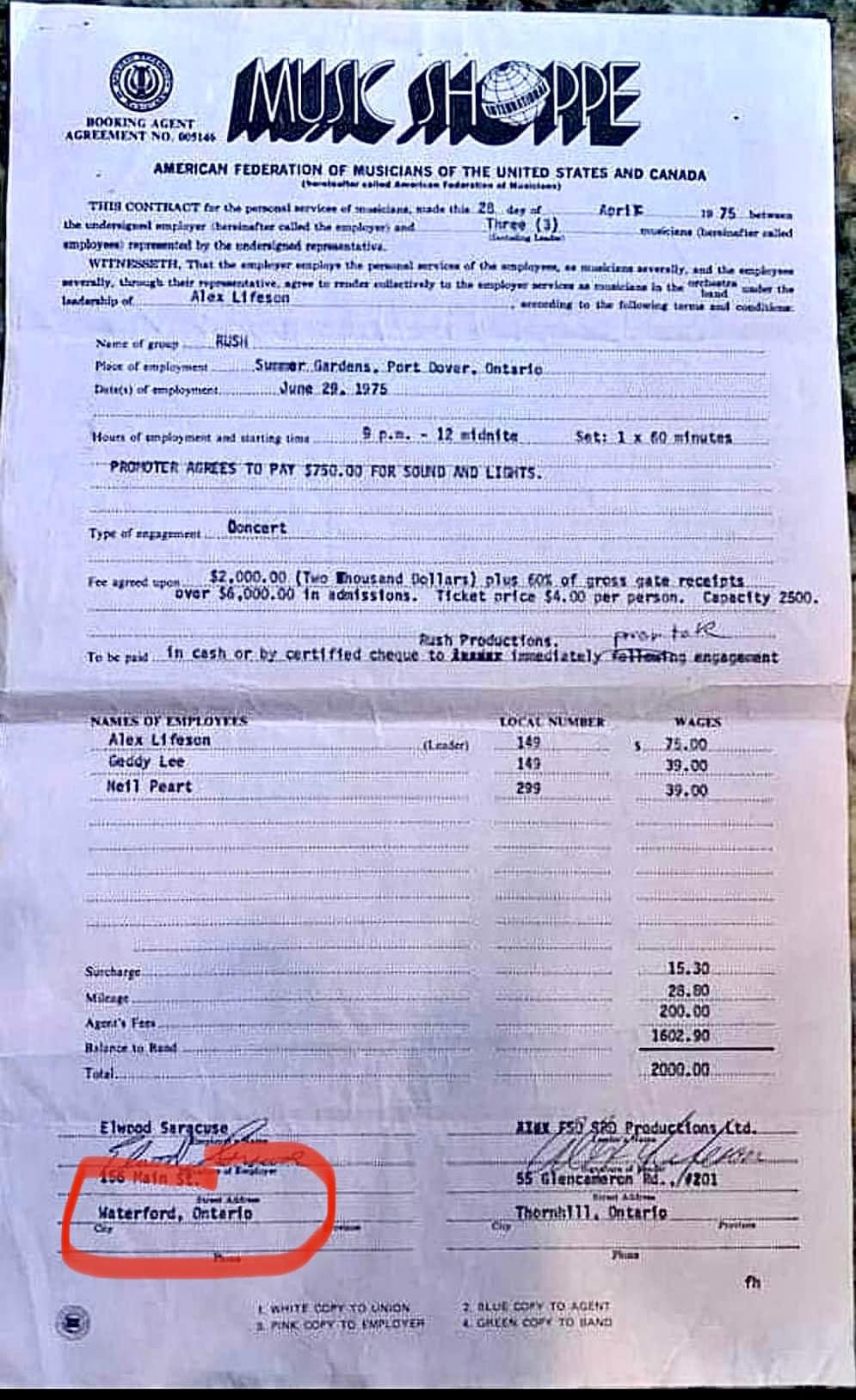 Interesting contract for a performance by Rush in 1975.