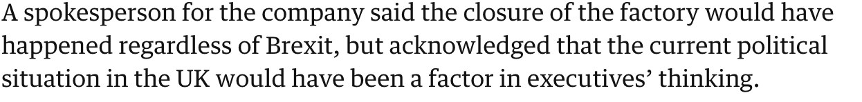 From the link that you kindly provided "A spokesperson for the company said the closure of the factory would have happened regardless of Brexit," I'm getting a bit fed up with your constant stream of lies as this is the second time today that you have insisted that something is a direct result of Brexit when it clearly isn't Caught in the act.