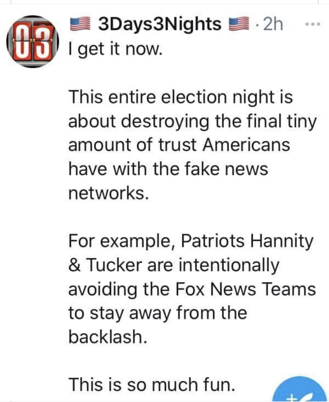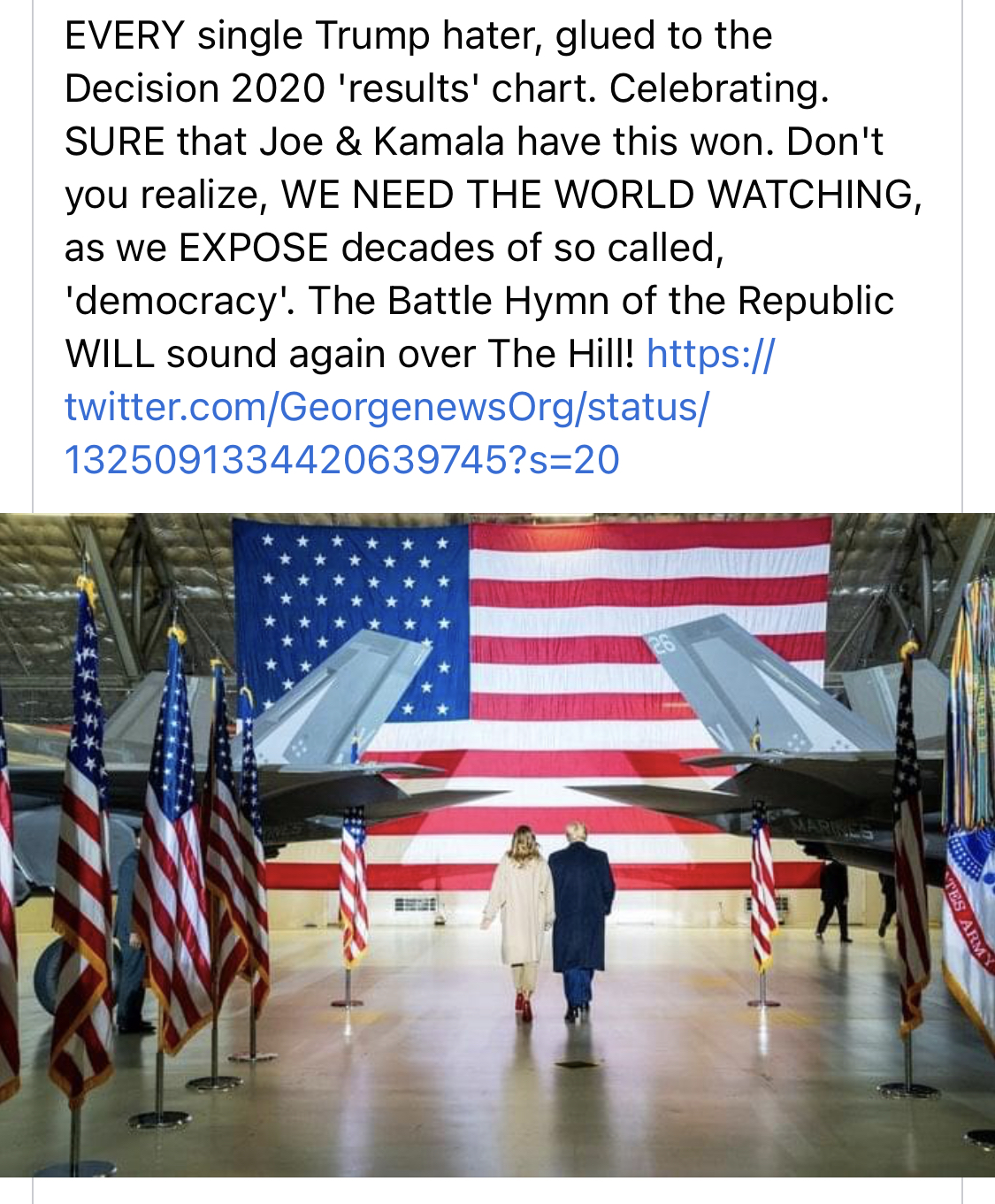 It is far from over. This is exactly planned 100% They’ve always said they need to show you rather than tell you Trump was playing golf today whilst hearing this news. That is to show the anons (me!) That chill, it’s in hand Everyone in the community is happy right now. Cheery. Not upset at all. They consider this planned. Most of the stuff mentioned in Q points to this so all good They’ll prove they cheated which will lead to arrests But the evil plus main stream media. Inc our own - they apparently pushed him being president. They said it. Wasn’t officially mentioned. Media dictated the narrative. Ballots were still being counted Media pushed this because they know trumps team will prove otherwise and win. So the idea from the dems and media is - tell the democrat voting public Biden won for now, then trump wins in a month or whatever = civil war / chaos Anything to not get the likes of Obama, Biden and top media ceos arrested