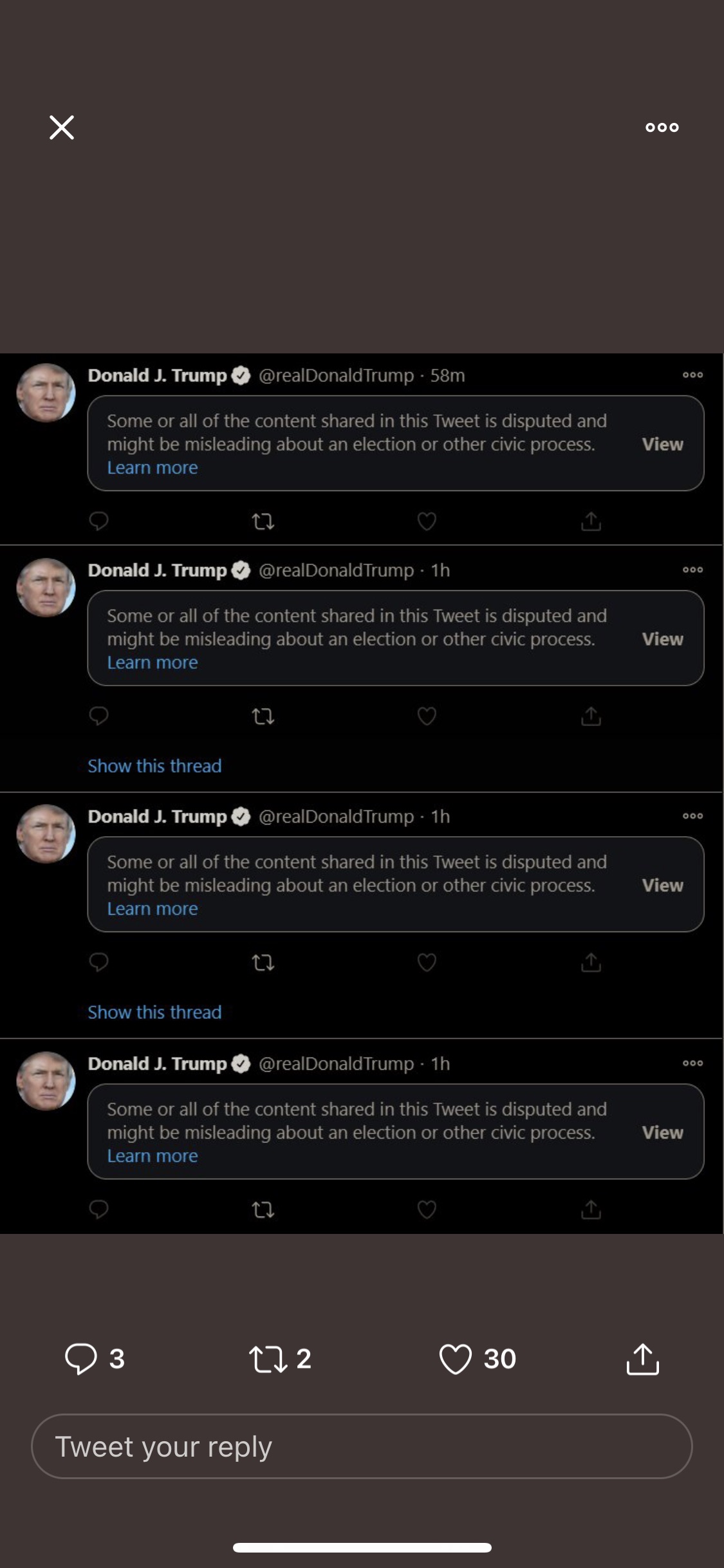 Twitter silencing the president of the United States. They rue this one day Remember. They know Biden hasn’t won. Once this goes to court, they’re fkd. CEOs of msmedia too who have helped push this Biden campaign as they are currupt. So by pushing the narrative quickly and falsely that Biden won, once trumps team prove otherwise in a week or a months time - civil war. Chaos. It’ll be mayhem as all the democrat voters and people like you who think what I’m writing is garbage - won’t understand or accept it. That’s the only strength the shadow government have left Doing everything they can to not let the likes of Hilary, Biden Obama etc go away