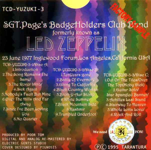 Todays first download is a set by Led Zeppelin which was recorded in LA in 1977. This bootleg has been put together using two audience sources - and sounds great for a bootleg this old. A great LZ show that features all the classics. What really makes this boot interesting is that the late Keith Moon joins the band on drums for a few tracks at the end - having a duel with John Bonham. Classic artwork in the style of SGT Peppers is included in the file... this is great stuff.... Here is a download link I found for :- Live at the Inglewood Forum, Los Angeles, CA 23.6.77 - SGT.Page's Badge Holders Club Band (AKA Led Zeppelin) (Bootleg) Quality : Superb Tracklisting : CD 1 CD 2 CD 3 Download Link : [Link] Filesize : 178MB (Including Artwork) Back Cover : [Link] Enjoy!