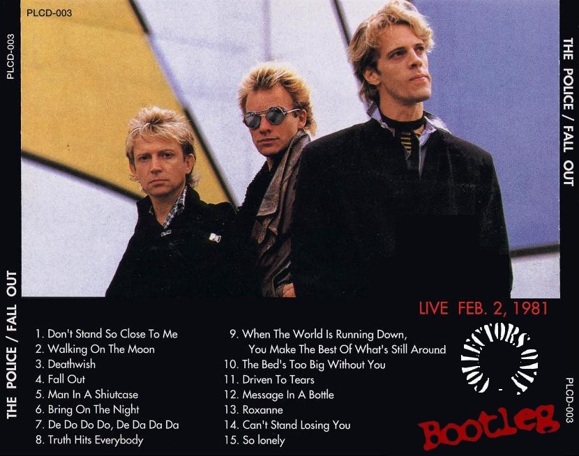 Todays first download is a set by The Police which was recorded in Tokyo, Japan in 1981. I seem to recall that this band were huge around this time and had a few top selling albums and loads of singles. A lot of the singles are on this bootleg which is in superb quality and a wicked set... This was recorded while the band were on tour promoting the "Zenyatta Mondatta" album... this is a top notch sounding boot and is thoroughly recommended....... Here is a download link I found for :- "Fall Out" Live at Budokan, Tokyo, Japan 2.2.81 - The Police (Bootleg) Quality : Superb Tracklisting : 01. Don't Stand So Close To Me Download Link : [Link] Filesize : 165MB (Including Artwork) Personnel: Back Cover : [Link] Enjoy!