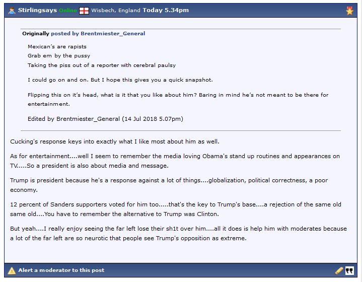 Amazing how everybody hates Trump but when Obama was bombing more countries then bush and attempting to overthrow more governments than any US president ever everybody loved him. People buy into the soundbite bollocks these days. Ultimately Trump has done a great job so far how could anybody deny it his followimg has only got bigger since taking office the neo liberal media and multinationals just dont want you to believe it. Just been voted the best American president in history. Amazing human being. Edited by Brentmiester_General (16 Jul 2018 9.55am)