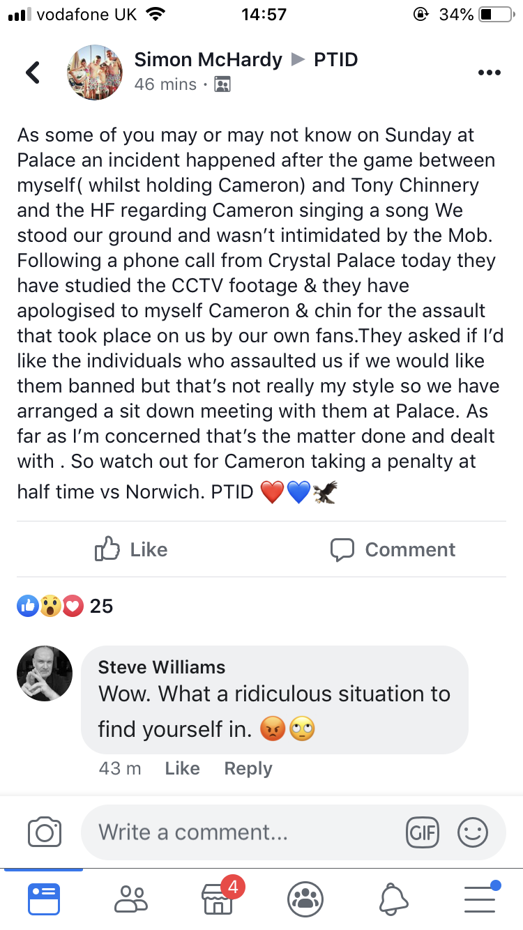 Just came up on Facebook, I’m guessing it’s all related ......... His posts are private on his Facebook page. Maybe a good idea. He’s going to meet them instead of agreeing with cpfc to impose a ban on them. Good on him. Make it one by one, hey! Starting trouble because someone else started a song. Jesus. I’m not on their side like I used to be. Actually I never was, but the case to improve the atmosphere was there. Unfortunately they’ve just decided to sing their own songs but in a different space so it isn’t what was it was pitched as it supposed to be. My stance has changed this season. They can pull it back but if they want their own thing then I really am not interested in them one bit now. Edited by Rudi Hedman (24 Sep 2019 3.13pm)