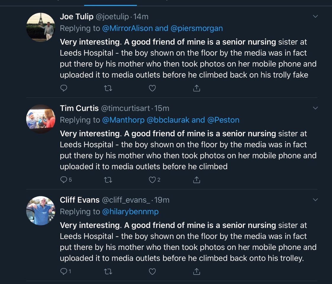Not sure it’s paranoid - the Facebook comment you linked yesterday whilst conclusively claiming the photo as fake is a bot - the same message has cropped up all over social media. I wonder who put that out there. Where is the information about the beds being available and when he went home? Why did the hospital see fit to apologise to the parents, specifying that they were sorry no beds were available? If it was a bot used for political purposes then I don't agree with or support that. I wasn't aware of that at the time and apologise. What matters much more is whether the information is true or not. As far as I'm aware the releases from the hospital don't support the claims made that a nurse(s) placed this child on the floor and absence of that shows the reality....at least to me....that is was a staged and politicised action.