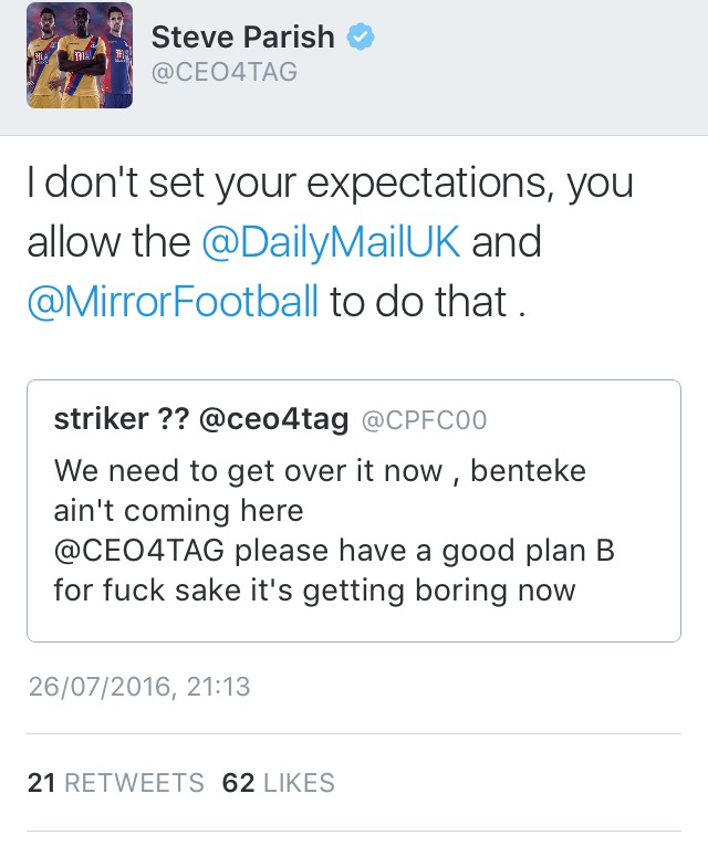 I am more than happy the way Palace do their transfer dealings. Just because we aren't being splashed about every back page with signings doesn't mean nothing is going on. We are an easy target. It is clear that we are in teh market for a striker and Pards is on record saying that he wants to add at least 2 more to the squad. We are cashed up so it isn't hard to use our name. The Batshuyai offer, I am sure was one to help Marseille out. Loads of clubs linked with him, none bidding, we say we are happy to pay 30mil they release that, no one else comes in for him we have a quality striker or we do them a favour and get them a bit of much needed cash no worries. The problem we are having is that the numbers being reported (30mil bids for both MB and CB) are now making it easy for agents to get their players in the shop window. All they have ot do is say Palace are in for their player and see what happens. The world knows we have the money, so it wouldn't be beyond the realm of possibility. I am sure it p!sses of Parish and co, they may well be in for a striker and trying to keep it on the DL but their agent wants to bump their payday. It also may help them with all these other names being banded about and then in a weeks time we are linked with a Slimani type and a few days later he signs. There is obviously no smoke without fire when it comes to Benteke, I would love him at Palace but I am very confident that we will have at least one top drawer striker coming through the door.