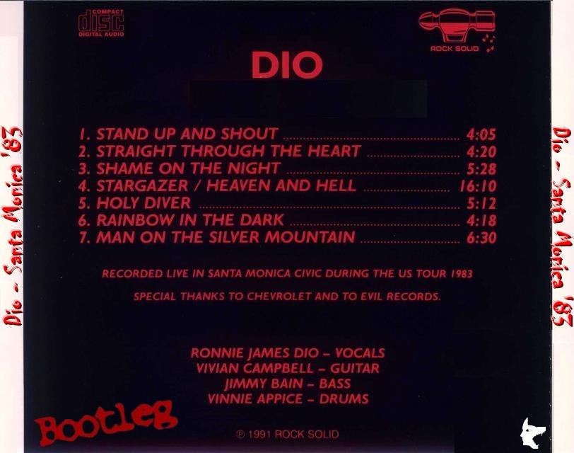 Todays second download is a set by the late Ronnie James Dio which was recorded at the Civic Centre, Santa Monica, CA in 1983. This is in superb quality and is a wicked set by RJD. I've posted a few boots by this artist over the years - this is a top quality sounding boot. If you like Dio, then this is thoroughly recommended... Here is a download link I found for :- Live at the Civic Centre, Santa Monica, CA 7.10.83 - Ronnie James Dio (Bootleg) Quality : Superb Tracklisting : 01 Stand Up And Shout Download Link : [Link] Filesize : 106MB (Including Artwork) Back Cover : [Link] Enjoy!