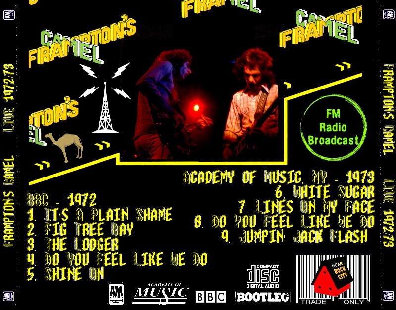 Todays second download is a set by Peter Frampton's Camel - not the band Camel who made albums like "Mirage or The Snow Goose". It was a bit confusing in the 70's for a time as there were two bands calling themselves Camel. This is Peter Frampton's Camel and a bootleg that was recorded at two venues - London and New York in 1972 and 73 respectively. Both are taken from FM broadcasts and are in excellent quality - although there is a little tape hiss on the first part of the boot - but it's not noticable when the music starts. The only song that is repeated is Frampton's anthem song "Do You Feel Like We Do" - the first version is a little longer, but both are wicked... If you like PF's Camel - then this is thoroughly recommended...... Here is a download link I found for :- Live in London and New York 1972/73 - Peter Frampton's Camel (Bootleg) Quality : Superb Tracklisting : Live at the BBC - 1972 Live at the Academy of Music, NY - 1973 Download Link : [Link] Filesize : 62MB (Including Artwork and Tracklisting) Back Cover : [Link] Enjoy!