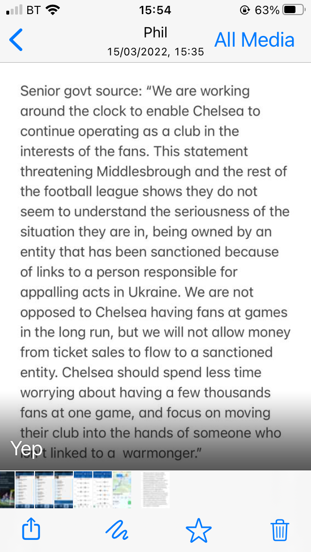 By the way, I do think this is going to radically change football, not just Chelsea. When all is said and done and at some future point the situation in Ukraine is resolved, the days of questionable money pouring into the sport and beneficiary clubs doing little more than buying success unabated will draw to a close. And that will be good for all of us. Last night's game was exciting and a great result for us but sport really shouldn't be won and lost at your banking facility rather than on the pitch. We shouldn't have to celebrate a 0-0 draw at home simply because questionably-sourced foreign cash has dictated the terms of engagement. Ironically, for all we criticise American sports and their franchised approach (mostly for good reason) one thing they have got right is how they administer their leagues (via salary caps, spending restrictions, and so on). It reflects well that teams like the Milwaukee Bucks (NBA), and Atlanta Braves (MLB) win championships despite playing in second-tier markets and not being big, name-brand teams while the New York, Chicago, and other major market teams often struggle. It's a level playing field where anyone can beat anyone else that the Premier League could well do with imitating. In my view every team, if they're well run, ought to be able to compete with and beat every other team. That is not the case right in the PL right now, and it needs to change. Getting rid of dubious foreign money would help do that.