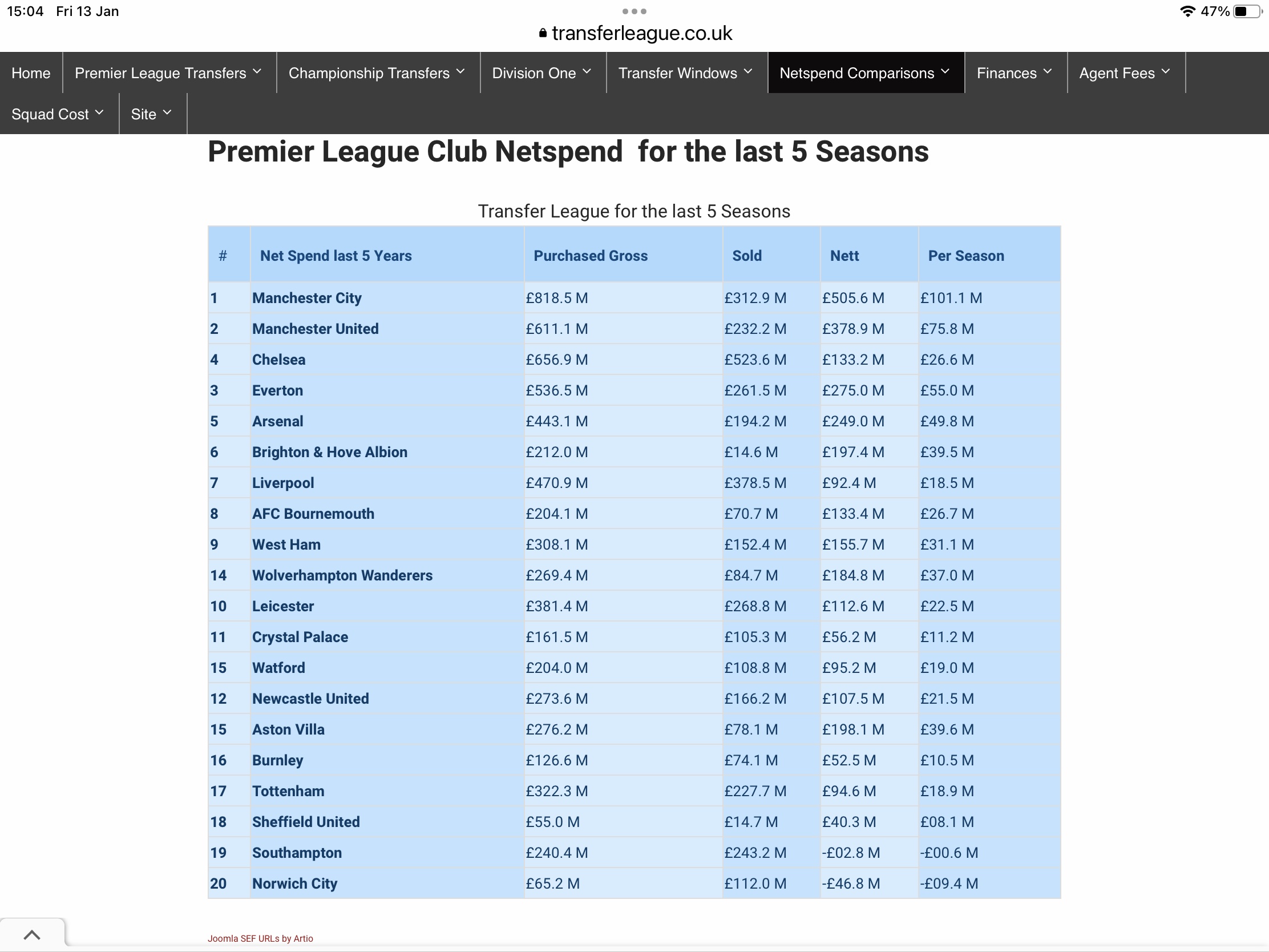 You are correct about Brighton’s net spend 3 to 5 years ago, but more relevant are the figures for the last 5 years: 16) Crystal Palace: £-72.8m 17) Brighton: £-62m Source: [Link] Placing them 16th and 17th in the Premier League net spend table. Brighton’s average over this time per year is £2m less than Palace! Originally posted by Willo