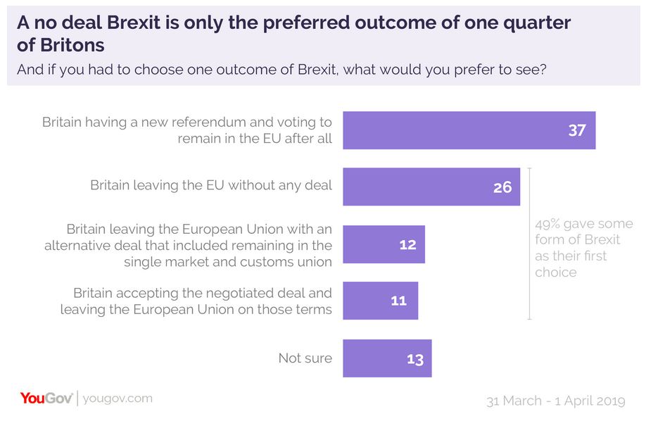 Not really. This was published today: Majority see no deal as bad f&cking news, and majority want a second referendum. I’m referring to the YouGov poll in which 44% preferred no deal and 42% preferred remain.