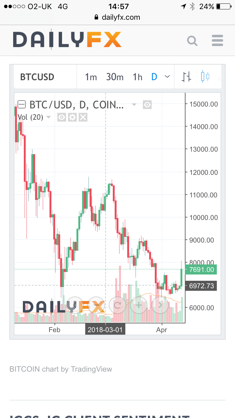 Bitcoin gone up massively over the last hour or two. Currently 10% up on yesterday It's a big move vs the last few days but in context it's not that big considering what's happened before. If the FTSE fell from 7,000 to 2,500 and then rallied 500 points it would be treated how you'd expect in such a volatile market. I'm not involved, but if I was, I probably would've bought some around ,500 and then some at psychological round number levels of 0 down to about ,500. Edited by Rudi Hedman (12 Apr 2018 3.04pm)