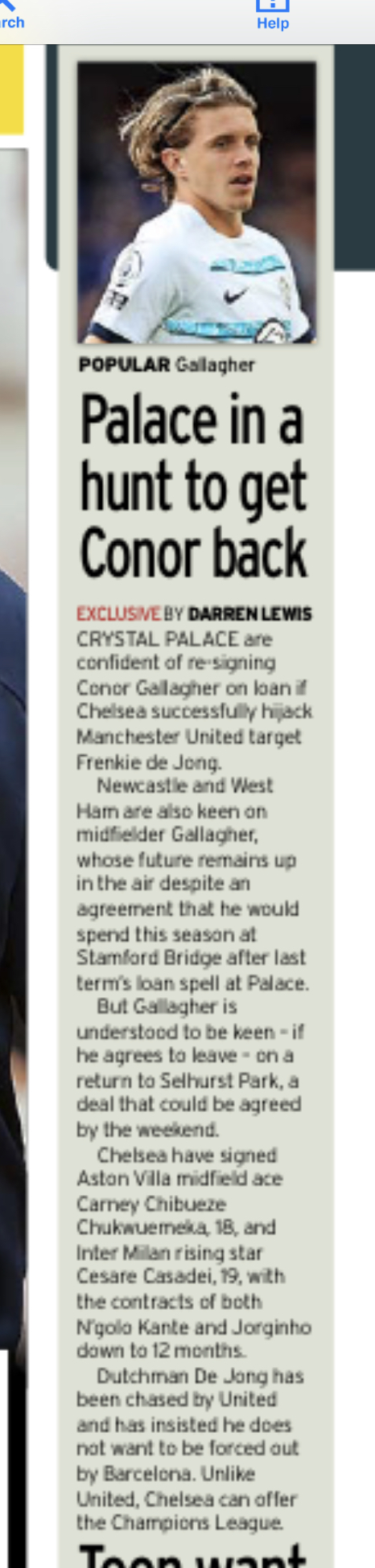 Todays papers report that Conor Gallagher could be set for a return to Palace if Chelsea sign Frankie Dejong. Apparently we are Conor's prefered destination. Please let this happen.