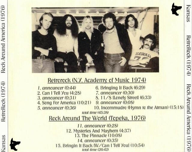 Todays second download is a bootleg by Kansas that was recorded in New York and Topeka during 1974-76. This is in superb quality and I believe the audio has been taken from an FM broadcast. This set has a lot of announcer talk between tracks - they can easily be deleted as they are in seperate tracks - I was gonna take the chat out but decided to leave it and let you decide whether to keep it or not. A cracking boot though - Kansas always put on a good show... this is thoroughly recommended... Here is a download link I found for :- Retrorock and Rock Around America - Live New York & Topeka, Kansas 74-76 - Kansas (Bootleg) Quality : Superb Tracklisting : 01 Announcer Download Link : [Link] Filesize : 166MB (Including Artwork) Back Cover : [Link] Enjoy!