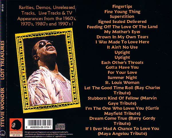 Todays first download is by Stevie Wonder and a collection of Rarities, Demos, Unreleased Tracks, Live Tracks & TV Appearances from the 1960's, 1970's, 1980's and 1990's. I assume this has been put together by a fan - I can't see no official listing for this anywhere. It's in great quality and features some great tracks. This is a great compilation of SW's work over a 30+ year period.... thoroughly recommended.... Here is a download link I found for :- "Lost Treasures" : Rarities, Demos & Unreleased Tracks 60's-90's - Stevie Wonder (Bootleg) Quality : Superb Tracklisting : 01 Fingertips Download Links : Part 2 : [Link] Filesize : 130MB Back Cover : [Link] Enjoy!