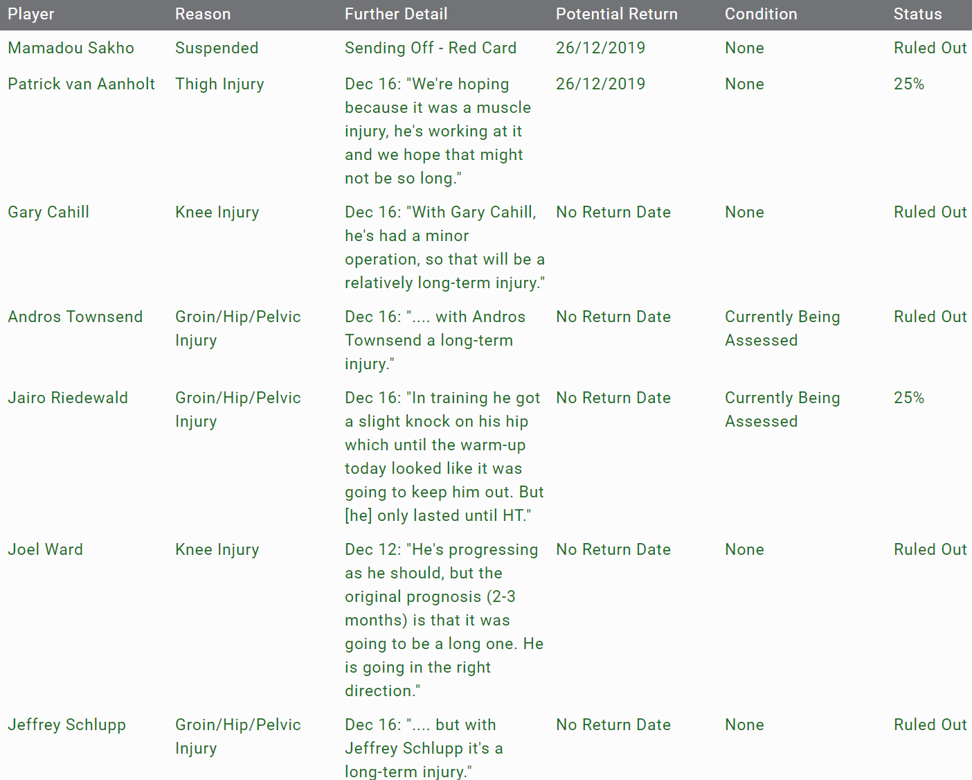 Not mentioned much but I though James Tomkins was heroic His sublime flicked on header to Zaha produced the goal. Cahill is a loss but if Sakho is back to partner Tomkins 3 game ban so not back until the 26th