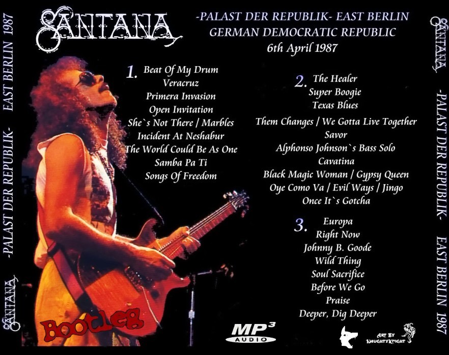 Todays first download is a superb 3 disc bootleg by guitar legend Carlos Santana. This was recorded at the Palast Der Republik in East Berlin in 1987. This is a top notch bootleg by CS and he plays some classic stuff like Samba Pa Ti, Black Magic Woman, Europa and part of the Concierto de Aranjuez by Joaquin Rodrigo. This is a great show... Here is a download link I found for :- Live at The Palast Der Republik, East Berlin, Germany 4.6.87 - Santana (Bootleg) Quality : Superb Tracklisting : CD 1 CD 2 CD 3 Download Link : [Link] Filesize : 165MB (Including Artwork and Tracklisting) The Line-up : Back Cover : [Link] Enjoy!