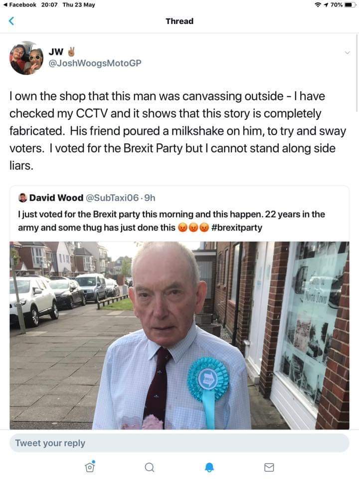 Fake news,he threw yoghurt on himself for publicity, the person who owns the shop next to wear this guy stood studied his cctv and said it didn't happen. The shop owner said he voted for the brexit party