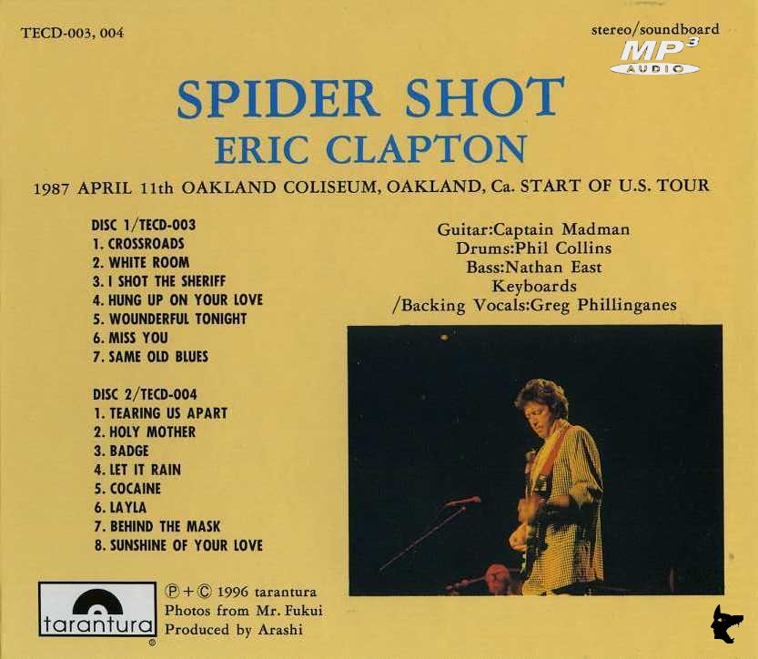 Todays first download is a bootleg by Eric Clapton which was recorded on his US tour of 1987. This is in superb quality and is a wicked set. Some real classics on this one - starting with "Crossroads" and into "White Room" and "I Shot The Sheriff"... a wicked opening. The ending is just as good with "Cocaine" followed by "Layla". Classic Slowhand.... this is thoroughly recommended..... Here is a download link I found for :- "Spider Shot" Live at the Oakland Coliseum, Oakland, California 11.4.76 - Eric Clapton (Bootleg) Quality : Superb Tracklisting : Disc.1 Disc.2 Download Links : Part 1 : [Link] Part 2 : [Link] Filesize : 226MB (Including Artwork and Tracklisting) Back Cover : [Link] Enjoy!