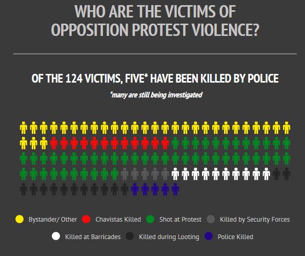 At least 124 people have died since opposition-led protests aimed at toppling the government began. In addition to those killed, hundreds have been injured in the protests. Right-wing opposition leaders have attempted to portray the deaths as examples of state repression and evidence of the "dictatorship" that they are aiming to topple. Mainstream media have by and large echoed this version of events, using titles like “Venezuelan Regime Has Blood On Its Hands” and “Venezuela's Tiananmen Moment." Some outlets have even gone as far as claiming the elected government of President Nicolas Maduro as engaging in “a campaign of state genocide.” The reality of the situation on the ground, however, demonstrates something very different. Here’s a breakdown of those killed since the opposition protests began. Breakdown is in the link. Thanks for providing that. It's interesting that you ignore the main media view on this and search out an alternative view. But I won't criticise that. However I'm suspicious of this article. For example, the attached graphic of a snapshot of deaths. If headlines the view that five were killed by Police yet ignores the security deaths shown on its graphic itself...why just mention Police? Also it has twelve pro government deaths yet manages to somehow ascertain that these other deaths are not caused by partizans. I'm suspicious of the article but at least it's another view. I will continue to try to ensure that I have as accurate a view as possible. I'll look to see what human rights watch are saying. Edited by Stirlingsays (13 Aug 2017 12.17pm)