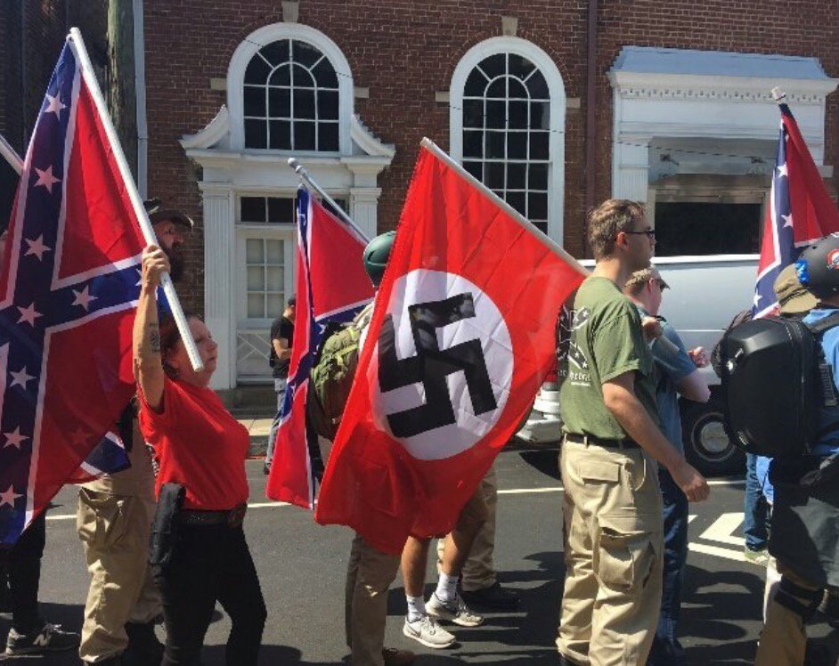 Could you stop mis-labelling them, they aren't 'Nazis'. 'Nazis', are specific to their time and place....It's just a silly rallying cry. They are the far right from what I can tell....I find it hard to gather up the interest to find out.....But I know they aren't 'Nazis' Nick. Well the mayor of Charlottesville refers to them as "Nazis", [Link] in fact, there has long been an American Nazi party, Emboldened by Trump and his courting of these groups they have joined with other white supremacists and now look like they're confident enough to go overground