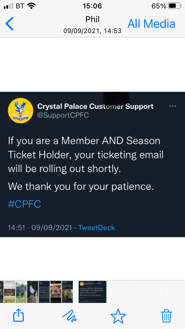 Took me a while today and was about to go over to club when I thought, 1 more go and there was my season ticket. Why it wasn’t there when I looked earlier I don’t know - grrrr! Also just had a visit from my neighbour who is having problems and he has an iPhone 6 which must be why he can’t download. Seems rubbish that it’s all geared to newer models for which many don’t have? What a palaver :-( If you read the release, it's a phased roll out to accounts over the course of the day. Not all tickets are landing at once, either due to technical reasons or something else. This is fairly standard practice. In reply to some of you who are wondering how you can share tickets if you are going to miss games and want to pass onto a mate – there is a hack until it becomes clear... Simply log in to the Palace app using the persons login details that you're borrowing the ticket off and download to your wallet. Now obviously, you don't want to share this with any old random but as a temp fix you can technically have an unlimited number of season tickets on your phone using this method.