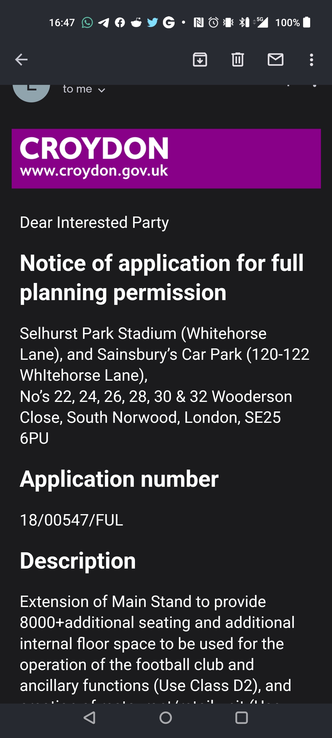 Same. Full revised planning application submitted 29th, final officers report submitted today, link below Details all the community and surrounding area investment plans if you are bothered about that sort of thing, eg Carbon Offset Edited by SW19 CPFC (12 Oct 2022 5.39pm) A truly mind boggling set of demands by planning, the particular strange one, 500 traffic signs required at a cost of £10,000, but they dont want any traffic near the stadium, then another £100,000 to improve cycle access to the stadium, who cycles to Selhurst Park.