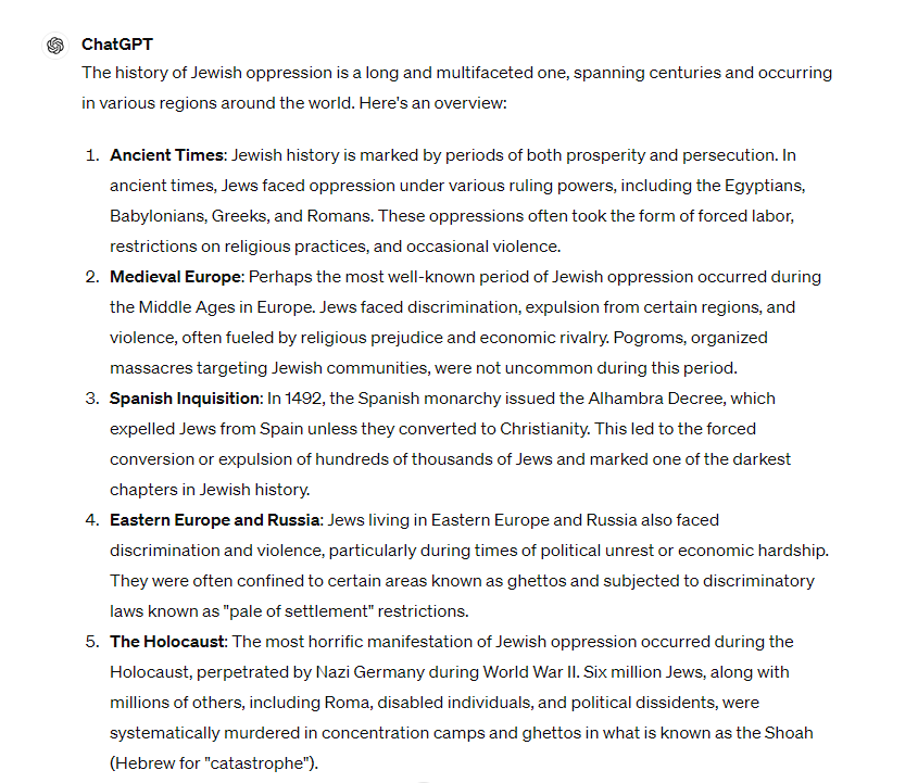 The oppression of Jewish people has a long and complex history, spanning centuries. Here are some notable examples of Jewish oppression, though this is by no means an exhaustive list: 1. Ancient Times: In ancient Egypt, Jewish people, along with other Hebrews, were subjected to slavery and mistreatment. This oppression continued until their liberation, as described in the biblical book of Exodus. 2. Expulsion from Judea: In 70 AD, the Roman Empire destroyed the Second Temple in Jerusalem and expelled Jewish people from Judea. This marked the beginning of the Jewish diaspora, a period of dispersion and persecution. 3. Medieval Europe: In medieval Europe, Jewish communities faced significant persecution. They were subjected to discriminatory laws, restricted from owning land, and often forced to live in segregated areas known as ghettos. Pogroms, violent attacks against Jewish communities, were also common. 4. The Inquisition: During the Spanish Inquisition of the 15th century, Jewis 5. Present day: anti semitism on the rise. I hate that word it's just pure racism nothing else. Just like Hitler convinced the Germans that the Jews were the bad people. Now the woke fraternity is doing the same. It's time to wake up. Blaming ,free democracies for the evils of terrorism and the aftermath of terrorist attacks. You reap what you sow. I typed into ChatGPT this morning: "tell me about the historic oppression of Jewish people" and I'm attaching a screen shot of what it told me. Amazingly similar in content and style to the above post!