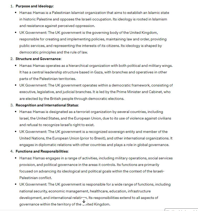 For those misguided people who think they can compare Hamas to the UK government being any UK government. Hamas, also known as the Islamic Resistance Movement, is a Palestinian political and military organization that operates in the Gaza Strip. It is regarded as a terrorist group by several countries, including the United States, Israel, and the European Union. Comparing Hamas to other governments around the world requires an analysis of its structure, ideology, governance, and international recognition. 1. Structure and Governance: 2. Ideology: 3. International Recognition: 4. Popular Support and Elections: When comparing Hamas to other governments, it is essential to recognize that there are substantial differences in legitimacy, international recognition, and adherence to democratic principles. While Hamas governs a specific region, it faces limited international recognition due to its ideological stance and militant activities, differentiating it from most governments globally. I asked ChatGPT to compare Hamas and the UK Government - attached is the reply... Edited by EverybodyDannsNow (17 Apr 2024 9.13am)